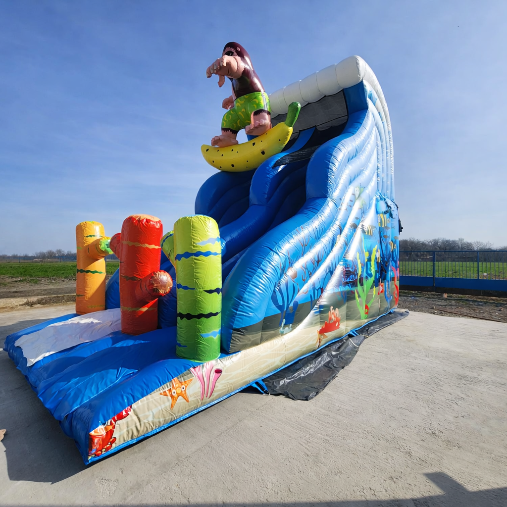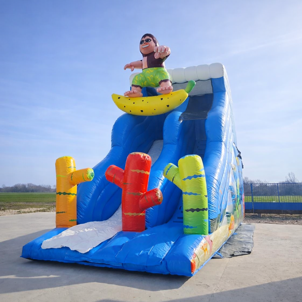 PagoTent Monkey Surfer tobogan na napuhavanje s atraktivnim 3D majmunom koji surfa na banani donosi dozu humora, zabave i adrenalina na svako događanje. Namijenjen je za korištenje djece i odraslih te pruža brzo, uzbudljivo i potpuno sigurno spuštanje koje će oduševiti sve sudionike. Veseli dizajn s majmunom surferom odmah privlači pažnju i stvara odličnu atmosferu za igru, natjecanje i fotografiranje. Savršeno će se uklopiti u sportske aktivnosti, obiteljska druženja na otvorenom ili teambuilding evente.
